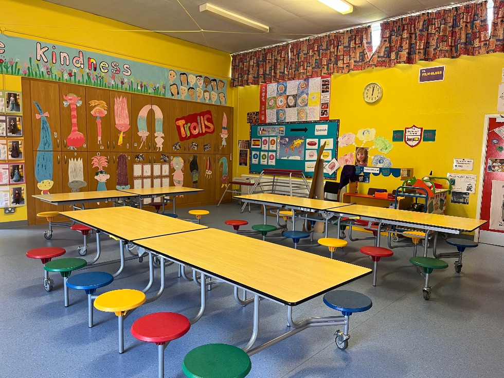 The hall is always busy, and is used for assembly, PE, canteen at lunchtime, and regularly for large scale art and creative activities. Recently purchased multi-purpose seating has enhanced its flexibility.